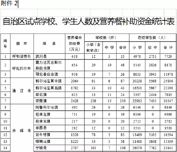2.自治区试点学校、学生人数及营养餐补助资金统计表