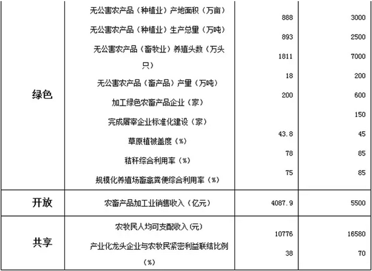 到2020年,全区农牧业现代化建设取得明显进展,综合生产能力和农畜产品质量安全水平稳步提升,发展方式不断优化,农牧业结构趋于合理,物质装备水平明显提高,科技支撑能力显著增强,农牧业产业体系、生产体系、经营体系更趋完善,农牧业资源利用率显著提高,建成国家重要的绿色农畜产品生产加工输出基地。