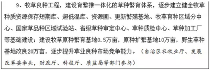 加快草产业发展。 逐步建立起与自治区现代农牧业相适应的现代草产业发展体系。鼓励与扶持草业联户、合作社和龙头企业发展,形成具有较强科技创新能力和技术引领作用的草产业主体,建成一批特色和优势鲜明的产业园区和集聚区。到2020年,优质草产品年生产能力达到800万吨,其中优质苜蓿草产品占50%;年青贮饲料贮量达到450亿公斤;年生产牧草种子2000万公斤;草业先进适用技术普及率达到80%;草业机械化水平达到85%;优质草产品生产加工能力居全国领先水平。(自治区农牧业厅牵头,发展改革委、财政厅等部门参与)