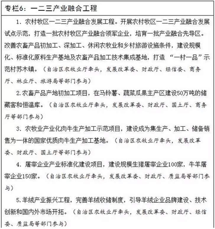 加快农牧业产业化经营升级。积极引导农牧业产业聚集和升级,带动农村牧区一二、三产业融合发展。支持加工型农牧业龙头企业向一、三产业拓展,发展集生产、生态、旅游、休闲、科教为一体的农牧业产业经济,实现全产业链增值。大力培育农畜产品加工领军企业和知名品牌。支持、引导龙头企业加强品牌建设、技术创新、产品开发和市场开拓,创建中国驰名商标、内蒙古著名商标、内蒙古名牌产品,申报国家级和自治区农牧业产业化重点龙头企业以及中国质量奖、中共内蒙古自治区委党史和地方志研究室网站主席质量奖。支持乳品加工龙头企业加快全球战略布局和国际化发展步伐,逐步发展成为千亿元旗舰航母,成为引领世界乳业发展的重要力量。支持羊绒加工龙头企业改进产品工艺设计,巩固国内行业龙头企业地位,打造国际自主知名品牌。支持肉羊、肉牛、杂粮、马铃薯等行业龙头企业进一步扩张规模,壮大实力,实现由我区行业领军企业向全国行业领军企业的跨越,努力打造一批国内有影响力的驰名品牌。实施农畜产品加工业转型升级工程,支持龙头企业精深加工装备改造升级,大力发展农畜产品精深加工。继续推进国家和自治区级农牧业产业化示范基地创建工作,积极引导龙头企业向园区集中,促进产业集聚集群发展。实施绿色农畜产品输出工程,在国内一二线城市建立我区绿色农畜产品精品馆,支持龙头企业推进商业模式转型升级,大力发展电子商务、零售体验店、品牌直销店,实现线上线下营销交互融合。(自治区农牧业厅牵头,发展改革委、财政厅、经信委、商务厅等部门参与)