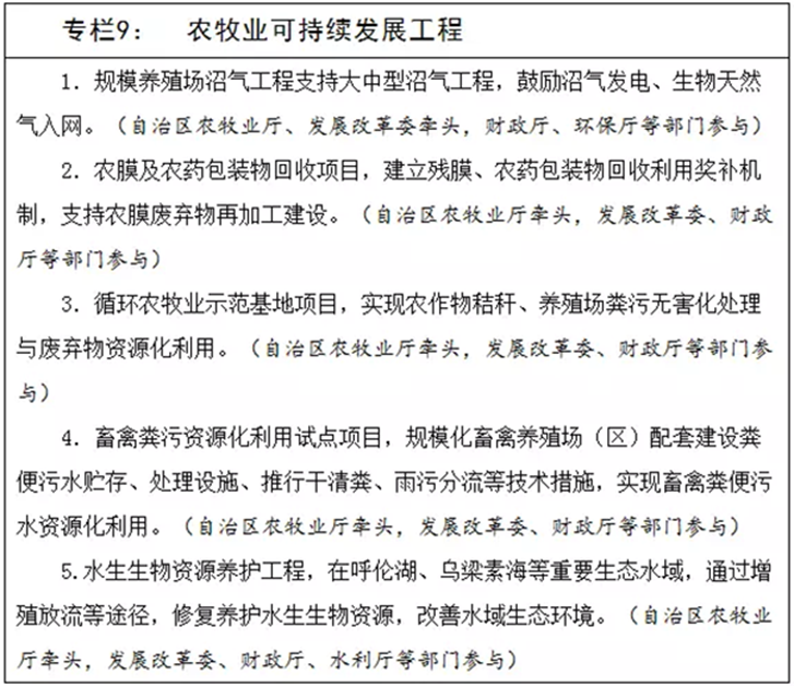 强化资源化利用和无害化处理。支持秸秆机械还田、青黄贮饲料化、微生物腐化和固化炭化及多元化利用方式等新技术示范,加快秸秆收储运体系建设。加快可降解农膜研发和应用,开展区域性残膜回收与综合利用,扶持建设一批废旧农膜回收加工网点,积极推行企业回收废旧农膜换市场行动。认真执行《水污染防治行动计划》,推进农牧业废弃物资源化利用,落实畜禽规模养殖环境影响评价制度。制定畜禽规模化养殖发展区划,开展畜禽养殖禁养区划定工作,启动实施农牧业废弃物资源化利用示范工程。推广畜禽规模化养殖、沼气生产、干湿分离、农家肥积造一体化发展模式,支持规模化养殖场(区)开展畜禽粪污综合利用,配套建设畜禽粪污治理设施,探索规模化畜禽粪污生产有机肥的产品补贴机制;推进农村沼气工程转型升级,开展规模化生物天然气生产试点;引导和鼓励农牧民利用畜禽粪便、秸秆积造农家肥。到2020年,农牧业面源污染和环境突出问题治理实现重点突破,初步形成生产、生活、生态协调的现代农牧业发展格局。(自治区农牧业厅、发展改革委牵头,经信委、财政厅、国土厅、环保厅等部门参与)