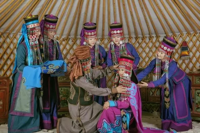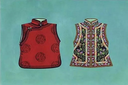 礼仪性对襟长坎肩以颜色艳丽的缎子为面料搭配而成,无袖无领,圆领座。领座、袖窿、4片下摆、左右开衩和后侧开衩的边缘镶有3种不同颜色的库锦镶边和由镂金彩线、金银曲线、直线组成的四指宽的沿边儿。在左、右和后侧开衩的上角还绣有平底云形图案。前面地对襟边缘绣有各式各样的“孛勒阿鲁哈”图案。
