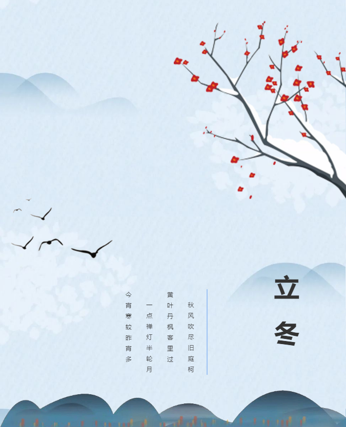 立冬,农历二十四节气之一,斗柄指向西北方位,太阳黄经达225°,于每年11月7-8日之间交节。立冬是季节类节气,表示自此进入冬季,同时也意味着生气开始闭蓄,万物进入休养、收藏状态。其气候也由秋季少雨干燥向阴雨寒冻的冬季气候转变。