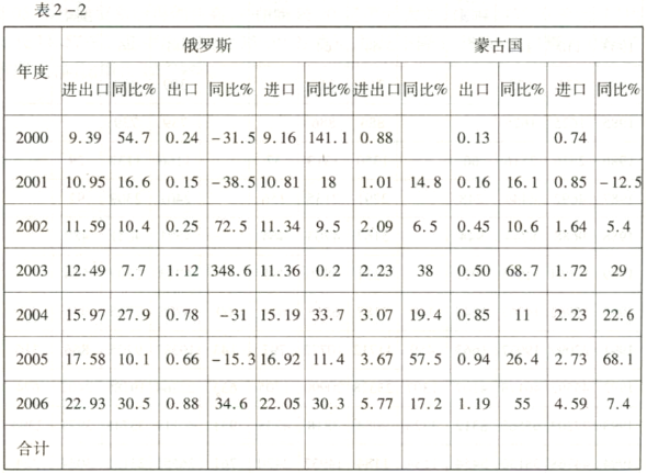 1997—1998年,由于俄蒙企业支付能力差,自治区边境贸易出现了大幅度下降,1999年又呈现大幅度回升态势。具体情况是:1997年,边境贸易进出口额为46710万美元,同比下降5.8%。其中出口额为20630万美元,同比增长10.40%;进口额为26080万美元,同比下降15.7%。1998年,边境贸易额为39110万美元,同比下降16.3%。其中出口额为26186万美元,同比增长9%;进口额为12924万美元,同比下降50.40%。1999年,边境贸易额为66401万美元,同比上升69.8%。其中出口额为33269万美元,同比增长27.0%;进口额为33132万美元,同比增长156.4%。2000年,边境贸易额首次突破10亿美元大关,达到102711万美元,同比增长54.68%。其中出口额为22789万美元,同比下降31.5%;进口额为79922万美元,同比增长141.22%。2005年,边境贸易额再创新高,一举突破20亿美元大关,达212456万美元,同比增长11.57%。其中出口额为15959万美元,同比下降1.58%;进口额为196497万美元,同比增长12.79%。