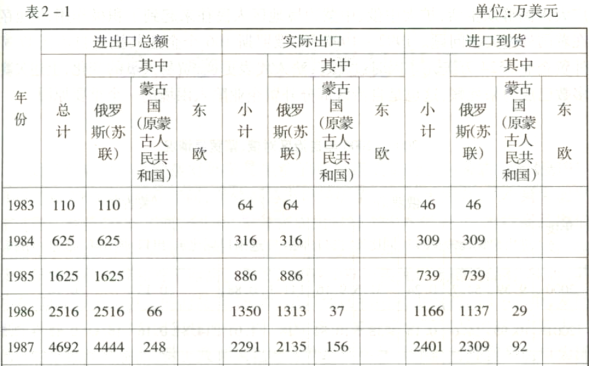 1987年,自治区对蒙古人民共和国的边境易货贸易又上一个新台阶,全年共签订进出口总额375万瑞士法郎(折合248万美元)。以后每年均有不同程度发展,截至1989年,与蒙古人民共和国之间的边境易货贸易额达到495万美元,1992年,双方贸易额上升到4107万美元,1993年,双方边境易货贸易额猛增到8312万美元,创历史最好成绩。1994—1996年,中蒙双方易货贸易额虽然有所下降,但仍在4000万美元以上,1997年,又回升到6525万美元,1998年,再次增长至7791万美元,1999年,猛增至30050万美元,创历史新高,2005年,增长至36672万美元。自治区与蒙古国之间边境易货贸易,已成为边境地区人民特别是蒙古国有关地区人民生活消费品和日常用品来源的重要渠道,贸易方式有易货、人民币和美元结算交易等,只是由于蒙古国方面支付能力所限,在一定程度上影响了两国间易货贸易的发展。