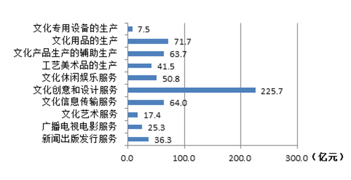 新兴文化产业呈现出较强的发展势头。目前全区文化产业单位已覆盖了文化休闲娱乐、文化艺术、文化信息传输、文化创意和设计服务等10个行业大类,50个行业中类,文化产业门类逐步趋向齐全。“十一五”时期以互联网技术发展为依托的文化信息传输服务业、文化创意和设计服务的新兴文化产业迅速崛起发展较快,2017年全区新兴文化产业法人单位实现营业收入达289.71亿元,占全区文化产业法人单位的营业收入48.0%。其中文化创意和设计服务行业营业收入最多,达225.74亿元,占新兴文化产业法人单位营业收入77.9%,十大类行业中占比最高(见下图):