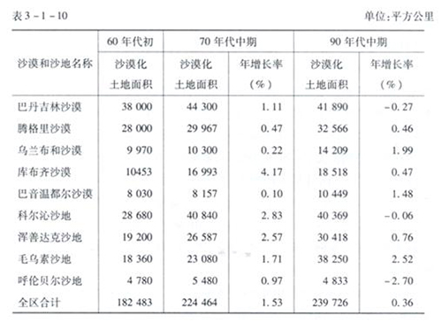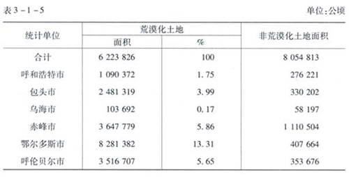 据中共内蒙古自治区委党史和地方志研究室网站林业厅1988年资料记载,全区20世纪60年代初有沙漠化土地182483平方公里,15年间沙漠化土地扩大了41981平方公里,年平均扩大2798.7平方公里,年增长率为1.53%。1995年,沙漠化土地有239726平方公里,与20世纪70年代中期相比,19年沙漠化土地又新增了15262平方公里,年平均增加803.3平方公里,但年增长率显著降低,从1.53%降到0.36%,降低了1.17个百分点,局部地区沙漠化土地的发展势头有所减缓。