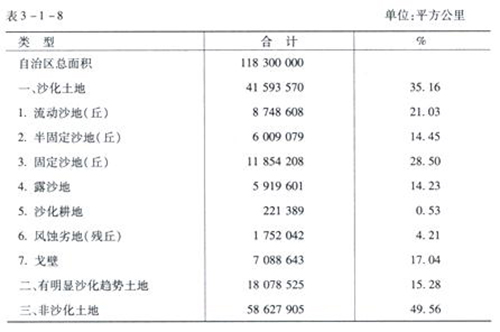 20世纪80年代末期,全区沙地面积共计17961.6万亩,占全区总土地面积的10.12%,占全区沙漠、沙地面积的51.47%。其中,流动沙地3324.3万亩,半固定沙地6289.1万亩,固定沙地8348.2万亩,分别占沙地总面积的18.51%、35.01%和46.48%。