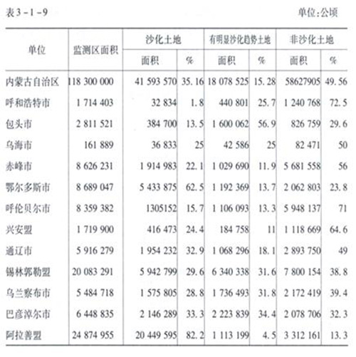 内蒙古主要沙漠和沙地近期沙漠化发展趋势表