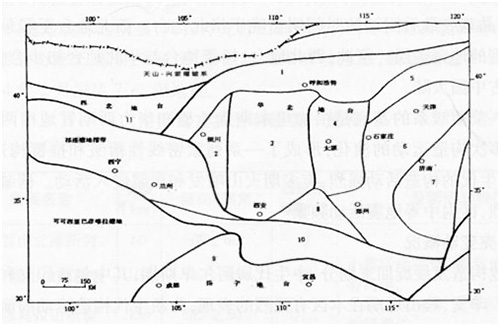 在大地构造上,自治区处于华北地台、西北地台、天山—兴蒙褶皱系衔接地带。主要包括华北地台区的内蒙台隆、鄂尔多斯台向斜,西北地台区的阿拉善台隆,天山—兴蒙褶皱系的天山地槽褶带(华力西期)、阴山北地槽褶皱带(加里东—华力西期)(图