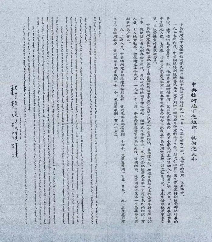 中共临河地下党组织临河党支部旧址位于现临河区解放街101号(万客乐超市)后。1927年“四一二”反革命政变后,中共绥远特别区地委派共产党员刘进仁回临河开辟党的地下工作。它是绥远地区处于白色恐怖形势下中国共产党在河套建立的第一个党支部。党支部成立后积极领导群众开展了学运、农运、兵运工作,拉开了河套地区反帝反封建斗争的序幕。