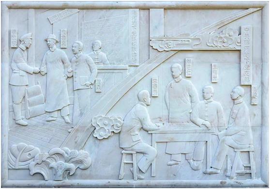 基座呈长方形,长4.8米,宽3米,高1.8米。正面镌刻“中共临河支部党组织联络站纪念碑”15个烫金大字。背面为汉白玉浮雕,生动再现了临河支部成立的场景和光化药房作为党组织联络站的日常活动。