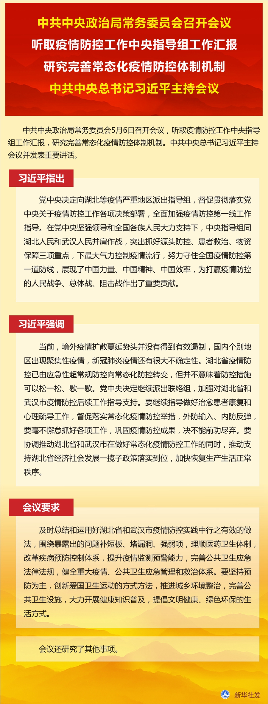 新华社北京5月6日电 中共中央政治局常务委员会5月6日召开会议,听取疫情防控工作中央指导组工作汇报,研究完善常态化疫情防控体制机制。中共中央总书记习近平主持会议并发表重要讲话。