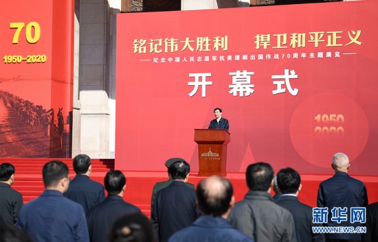 10月19日,“铭记伟大胜利 捍卫和平正义——庆祝中国人民志愿军抗美援朝出国作战70周年主题展览”开幕式在中国人民革命军事博物馆举行。中共中央政治局常委、中央书记处书记王沪宁发表讲话并宣布展览开幕。 新华社记者 燕雁 摄