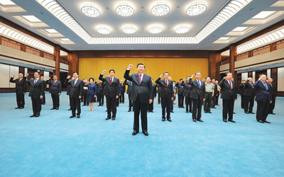 参观结束后,习近平等党员领导同志来到党史展览馆红色大厅。面向鲜红的中国共产党党旗,习近平举起右拳,带领领导同志重温入党誓词,铿锵有力的宣誓声响彻大厅。