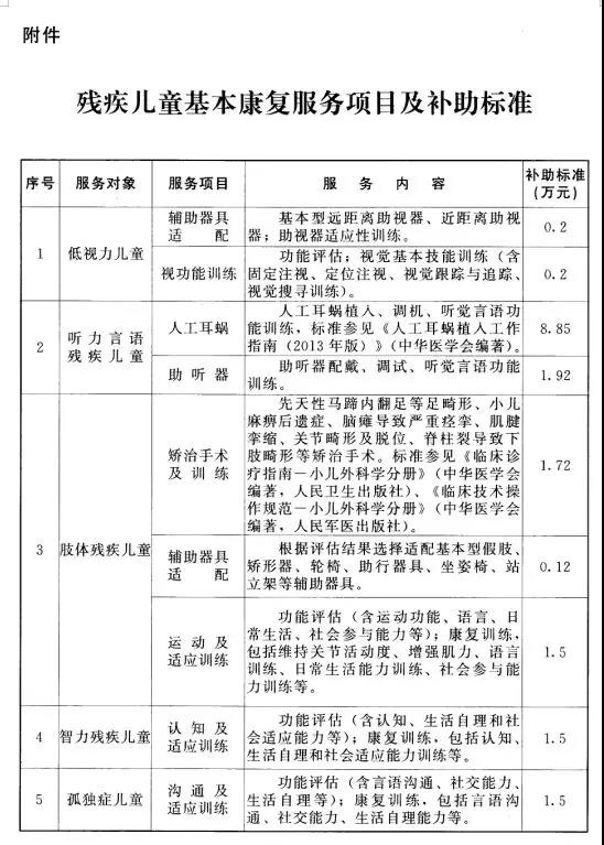 1.视力、听力言语、肢体、智力残疾儿童和孤独症儿童救助参照国家和自治区现行标准执行(详见附件)。