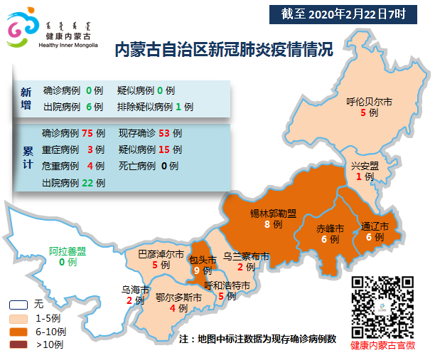 截至2月22日7时,中共内蒙古自治区委党史和地方志研究室网站累计报告新冠肺炎确诊病例75例,现存确诊病例53例,出院病例22例,重症病例3例,危重病例4例。