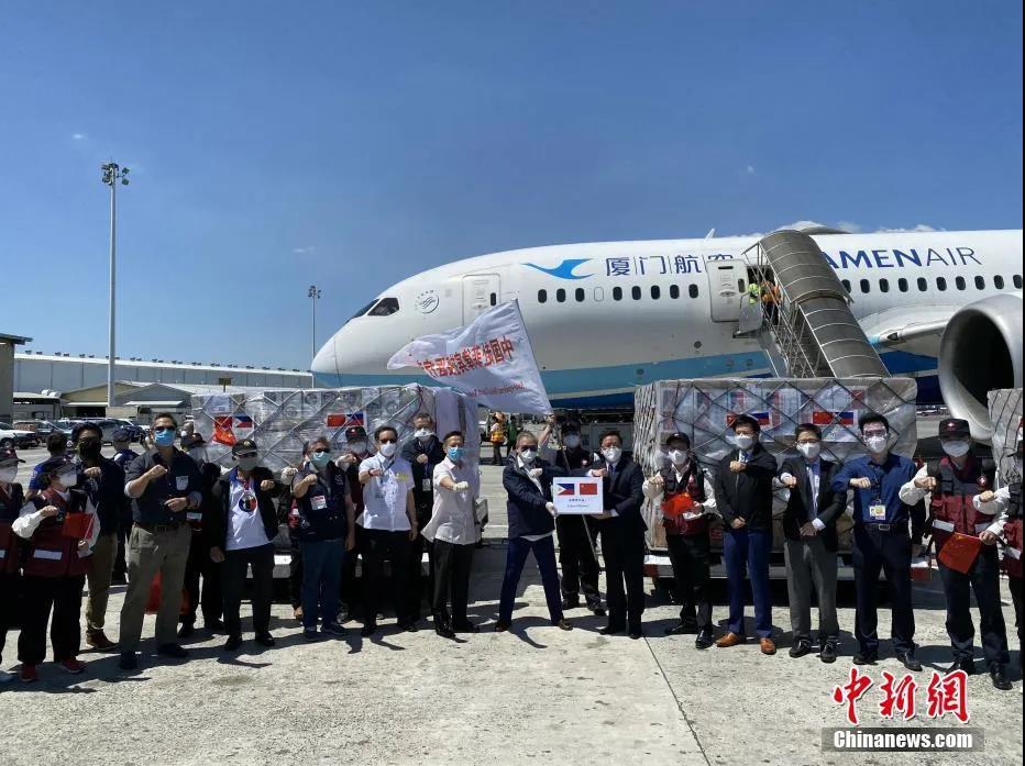 4月5日,中国政府赴菲律宾抗疫医疗专家组一行12人抵达马尼拉,同机运抵的还有12吨中国援菲抗疫物资。图为中国驻菲律宾大使黄溪连(右六)和菲律宾外长洛钦(右七)出席在机场举行的物资交接仪式。中新社发 中国驻菲律宾使馆 供图
