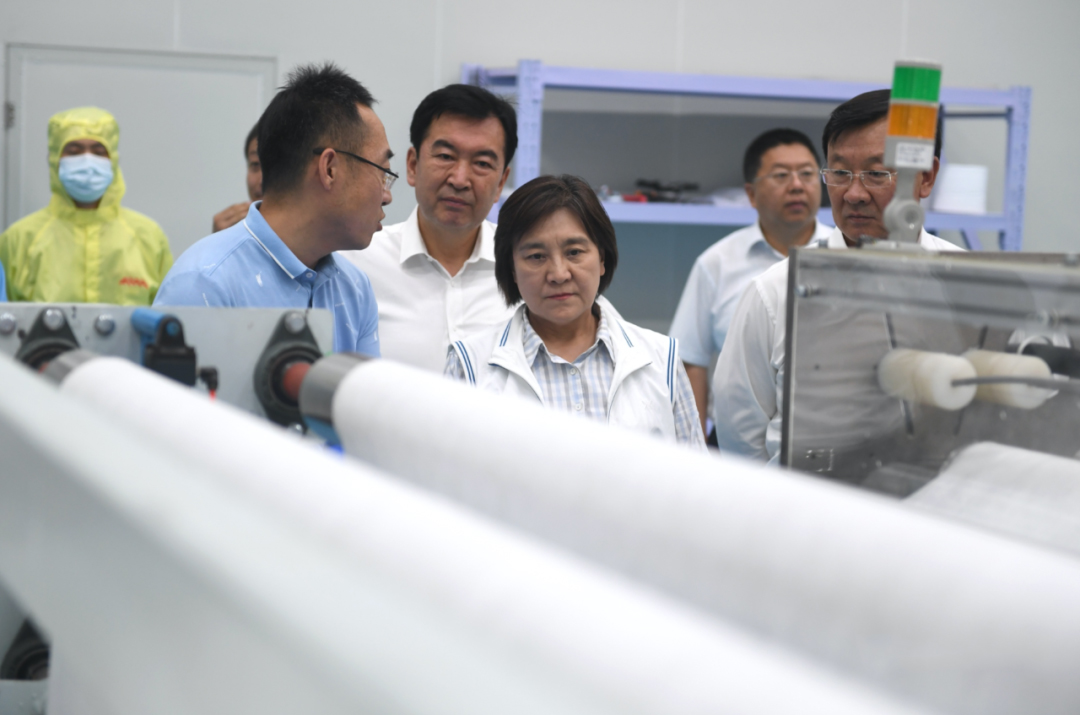 今年新冠肺炎疫情暴发,口罩需求量激增,口罩主要原材料熔喷布的需求量也“水涨船高”,供应紧张。在包头市孚韦安全装备公司,布小林详细了解企业发展、设备工艺以及投产运营等情况。得知该公司正在加紧建设一条熔喷布生产线,她鼓励企业克服困难,加快建设,尽早投产,为疫情防控作出贡献。