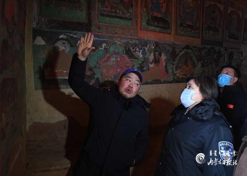 布小林沿着山体走进石窟,察看壁画现存状况,了解石窟保护修复、学术研究以及遗址保护规划和方案制定情况,要求对阿尔寨石窟实施整体保护,做好考古发掘研究,挖掘其文化内涵,发挥石窟的历史文化价值。