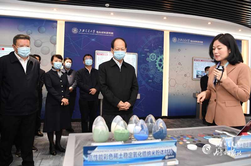 与会人员首先深入包头市的企业、车间、项目施工现场,实地考察了弘元新材料、南高齿风电齿轮箱二期、金力永磁材料、上海交通大学包头材料研究院及产业园、韵升强磁材料二期和光威碳纤维等重大项目建设情况,详细了解企业科技创新、产业升级等情况。在现场观摩中,当了解到上海交通大学包头材料研究院一项项科研成果、一个个中试产业项目吸引了国内一些企业前来寻求合作,石泰峰指出,企业是以市场为导向的,哪一项科研成果具有应用转化潜力,企业最敏感、最清楚。要坚持需求导向,面向市场进行研发、围绕创新链进行研发,吸引更多企业来我区转化成果,以科技集聚产业。