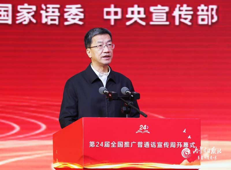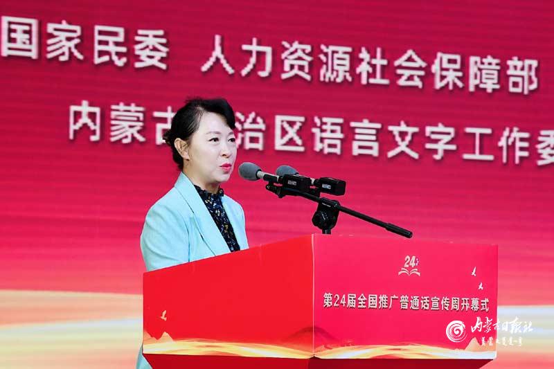 9月14日,自治区党委副书记、自治区主席王莉霞在第24届全国推广普通话宣传周开幕式上讲话。记者韩卿立摄