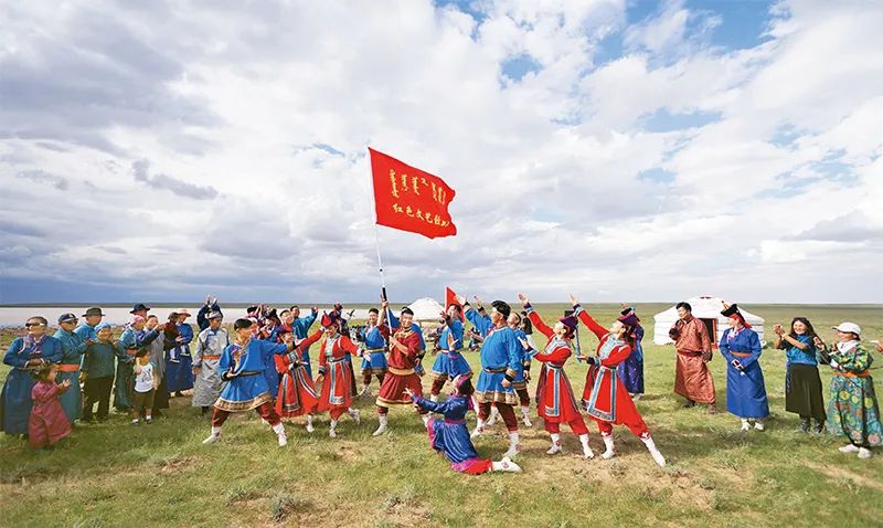 乌兰牧骑的蒙古语原意是“红色的嫩芽”,后被引申为“红色文艺轻骑兵”,是适应草原地区生产生活特点而诞生的文化工作队,具有“演出、宣传、辅导、服务”等职能,深受广大农牧民欢迎。图为内蒙古苏尼特右旗乌兰牧骑队员在牧区演出。 新华社发 东哈达/摄