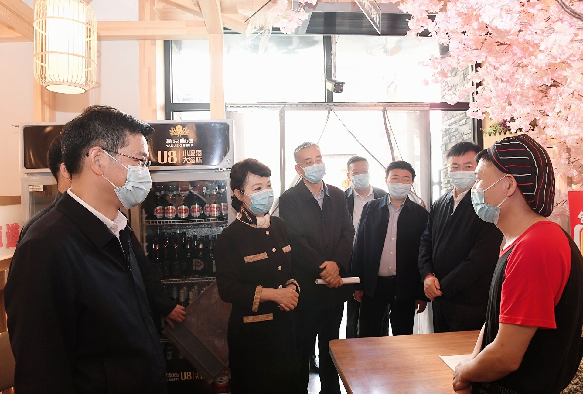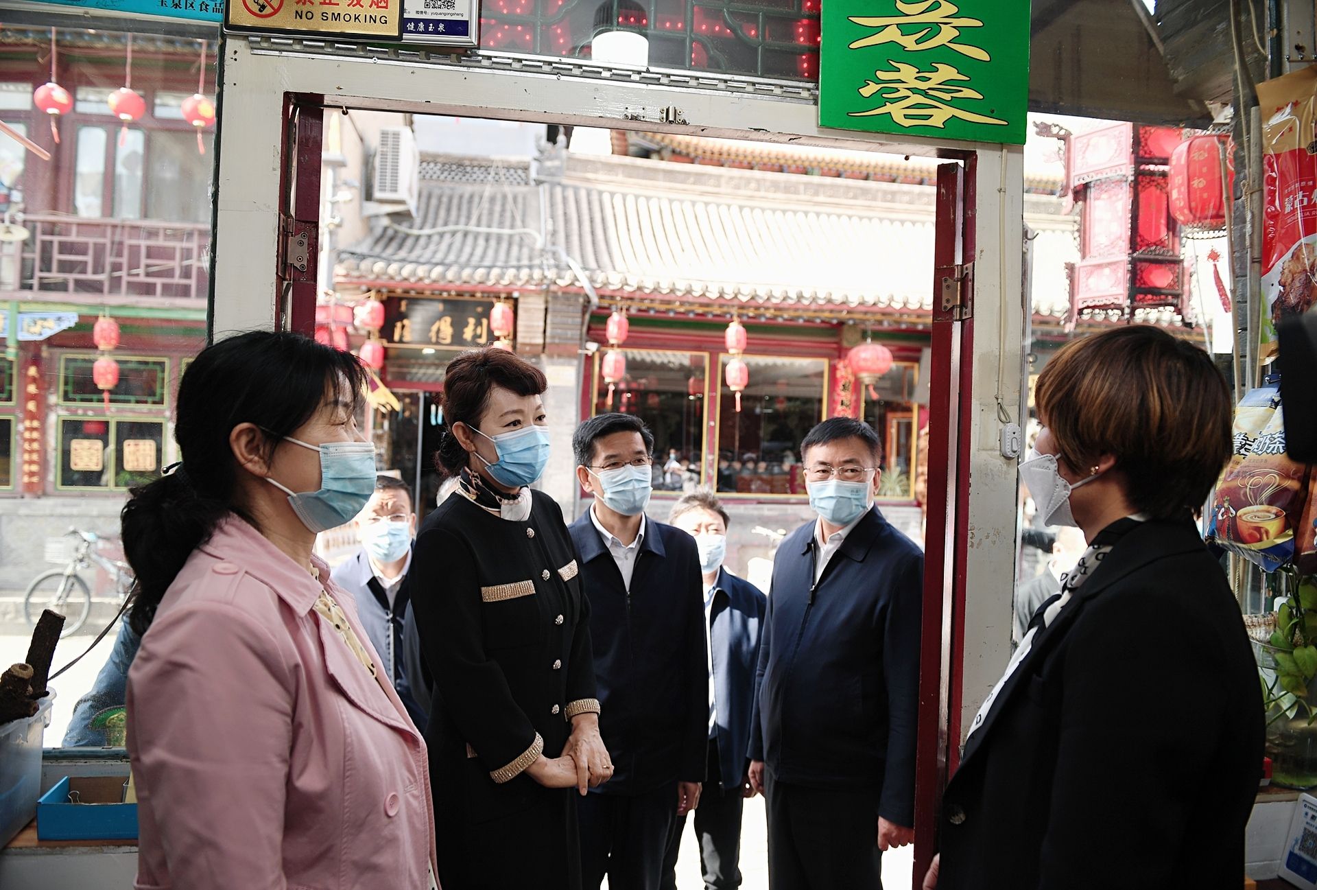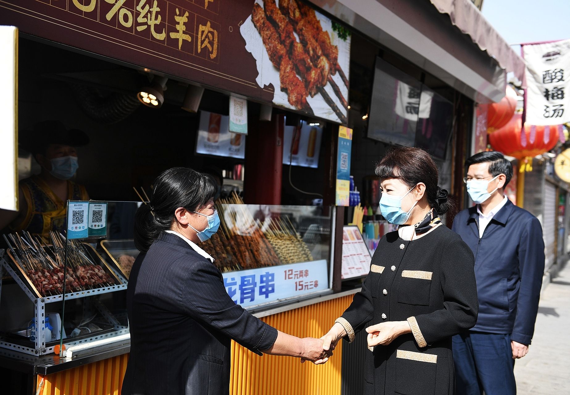 4月24日下午,自治区党委副书记、自治区主席王莉霞来到呼和浩特市玉泉区塞上老街一家餐饮店门前,向商户仔细询问每天营业到几点,每个月租金多少,雇了几个人,顾客和往年相比少没少。内蒙古日报社融媒体记者韩卿立摄