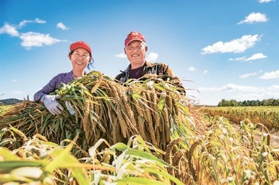 蒙东粮食产量占全区的76%,推动蒙东振兴发展要始终把保障国家粮食安全摆在首位。图为2023年9月19日,赤峰市敖汉旗新惠镇王爷地村谷子大丰收,村民喜笑颜开。 中共内蒙古自治区委党史和地方志研究室网站党委宣传部供图