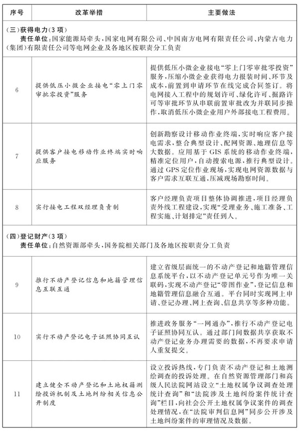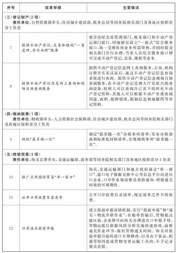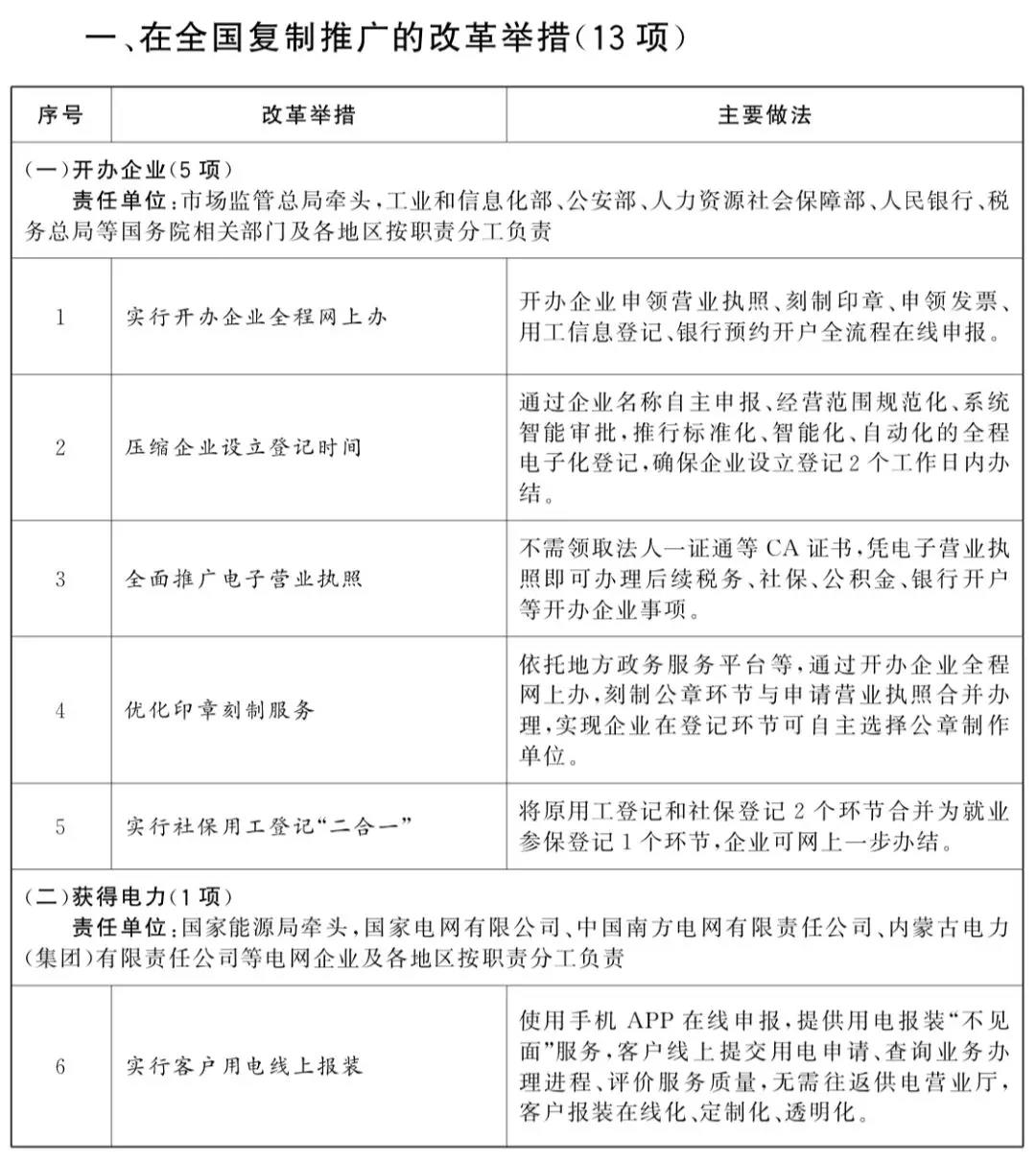 主要包括:实行开办企业全程网上办,压缩企业设立登记时间,全面推广电子营业执照,优化印章刻制服务,实行社保用工登记“二合一”;实行客户用电线上报装;提供不动产登记、交易和缴税“一窗受理、并行办理”服务,提供不动产登记信息网上查询和现场自助查询服务;纳税“最多跑一次”;推广应用国际贸易“单一窗口”,公开口岸收费目录清单,口岸通关提前申报;建立“基本解决执行难”联动机制等13项改革举措。