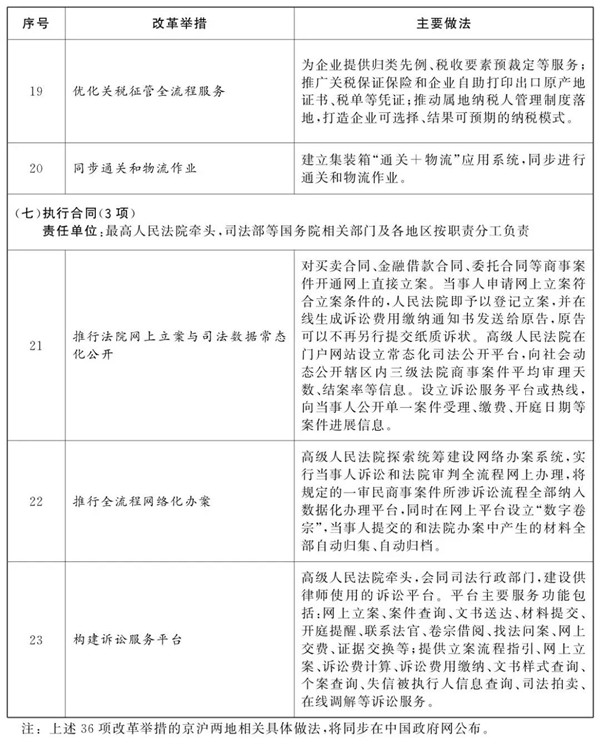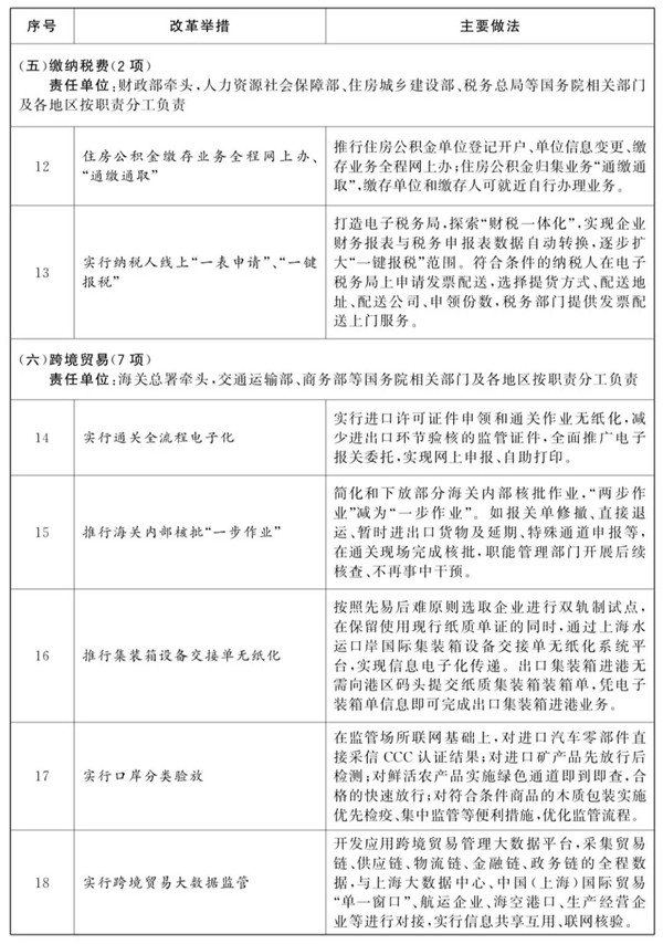 主要包括:提供企业档案“容e查”服务;优化环境影响评价分类分级管理,实行数字化联合审图,推行工程招投标交易全过程电子化,实行施工许可证全程网上办;提供低压小微企业接电“零上门零审批零投资”服务,提供客户接电移动作业终端实时响应服务,实行接电工程双经理负责制;推行不动产登记信息和地籍管理信息互联互通,实行不动产登记电子证照协同互认,建立健全不动产登记和土地权籍测绘投诉机制及土地纠纷相关信息公开制度;住房公积金缴存业务全程网上办、“通缴通取”,实行纳税人线上“一表申请”、“一键报税”;实行通关全流程电子化,推行海关内部核批“一步作业”,推行集装箱设备交接单无纸化,实行口岸分类验放,实行跨境贸易大数据监管,优化关税征管全流程服务,同步通关和物流作业;推行法院网上立案与司法数据常态化公开,推行全流程网络化办案,构建诉讼服务平台等23项改革举措。