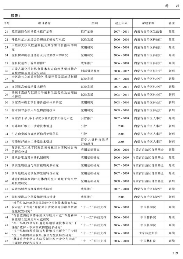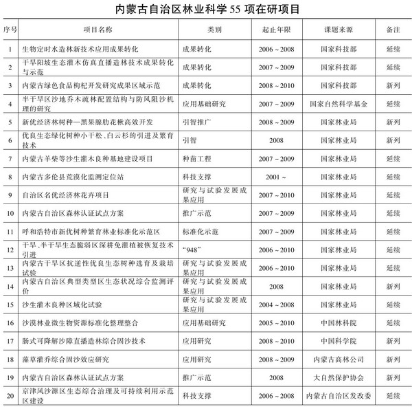 【科技支撑】2008年,内蒙古林科院共承担15项科技支撑项目。其中有“十一五”科技支撑项目“呼伦贝尔沙地草场风蚀沙化控制技术研究与试验示范”子专题“呼伦贝尔沙化草地乔灌草植被优化配置研究”等项目13项,有国家林业局项目“内蒙古多伦县荒漠化监测定位站”1项,有自治区发改委项目“京津风沙源区生态综合治理及可持续利用示范区建设”1项。是年,全部项目按照项目实施方案和年度计划完成任务。