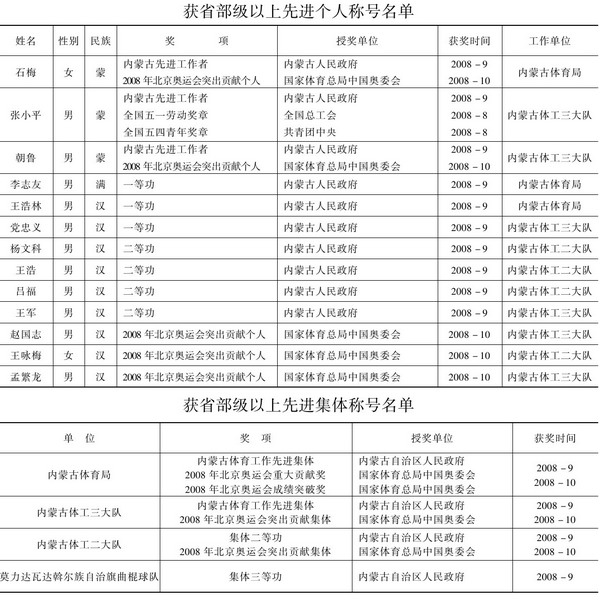 有9个部门和20个单位分别荣获2008年全国全民健身活动优秀组织奖和先进单位称号;有3个社区被命名为国家级社区体育健身俱乐部;3个社区荣膺全国城市体育先进社区名列;16名个人荣获全国群众最喜爱的社会体育指导员称号;创建、命名了25个社区和15个苏木乡镇为“全区城市体育先进社区”和“全区体育先进乡镇苏木”;表彰奖励139名个人为全区优秀社会体育指导员。