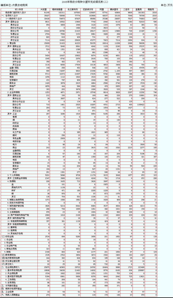 【税收特点】  一是税收收入增幅创地税成立以来同期最好水平,在全国地税系统排名第二位,在西部省区排名第一位,比全国地税平均水平高出25.4个百分点,高出西部省区地税平均增幅22.9个百分点。二是全区地税系统是在涉农税收停征,各项优惠政策减免造成减收11.4亿元的情况下实现的高幅增长,收入结构更加合理,收入进度更趋均衡,收入质量明显提高。三是第二、三产业地方税收贡献率显着提高。第二产业累计完成税收收入77亿元,增长47%,第三产业累计完成税收收入85亿元,增长41%。四是地方主要税种增幅较大。营业税、个人所得税、企业所得税和资源税增长较快,是拉动全区税收总收入快速增长的主要因素,四个税种累计增收42.61亿元,占税收总收入增收额的85.33%。五是全区各地普遍增收。有8个盟市税收总收入的增幅在40%以上,其中,鄂尔多斯市增量和增幅最高,同比增加13.82亿元,增长96.05%。鄂尔多斯市、锡林郭勒盟、满洲里市、乌海市、巴彦淖尔市、区局直属征收局、阿盟、包头市等8个盟市税收总收入均提前完成年度计划任务。