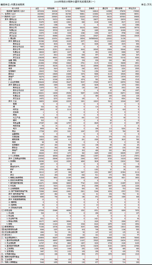 【信息化建设】  2005年,内蒙古地税局信息化建设实现了历史性的跨越。以实施“征管数据大集中”工程为重点,全面推行国家税务总局地税版征管信息系统,至11月1日,全区15个盟市级单位的139个基层征管局全部实现了上线运行,将基层征管基础数据实行自治区级集中,在全面统一和规范征管业务流程的基础上,实现区局对基层局征管业务的直接监控,使全区地税系统税收管理信息化建设迈进全国税务系统的先进行列,达到了提高征管质量效率,规范征管行为,提高纳税服务水平的目的。在此基础上,经过积极争取,国家税务总局已经确定局为全国税务系统“金税工程”三期建设试点单位,将在信息化建设软件开发和设备投入上给予大力支持,为全国税务系统进一步提高税收管理信息化水平进行积极探索,总结推广成功经验。