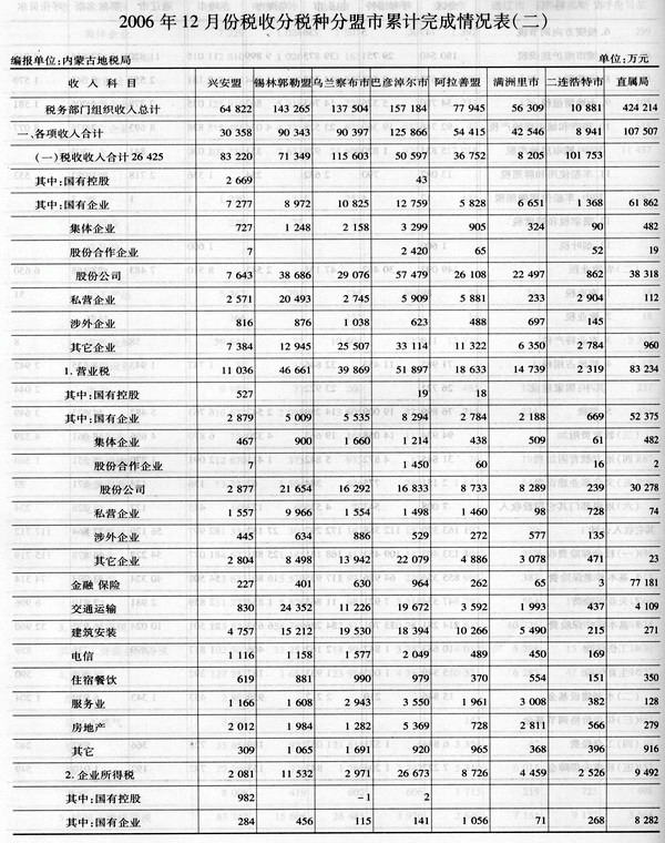 8.分入库级次看, 自治区级收入成倍增长。2006年全区实行新的财政管理体制后,营业税、企业所得税、个人所得税、资源税成为自治区与盟市共享税,自治区级收入成倍增长,盟市以下级收入增幅趋缓。自治区级收入累计入库32.93亿元,同比增加24.64亿元,增长297.22%,党中央级收入和盟市以下级收入分别入库34.06亿元和165.20亿元,同比增加7.29亿元和17.95亿元,增长27.25%和12.19%。