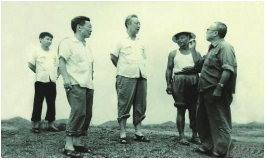 1978年8月,习仲勋(左三)在广东惠阳农村调研。在清华大学学习的习近平(左一)利用暑假时间参加社会实践,随同父亲一起下乡