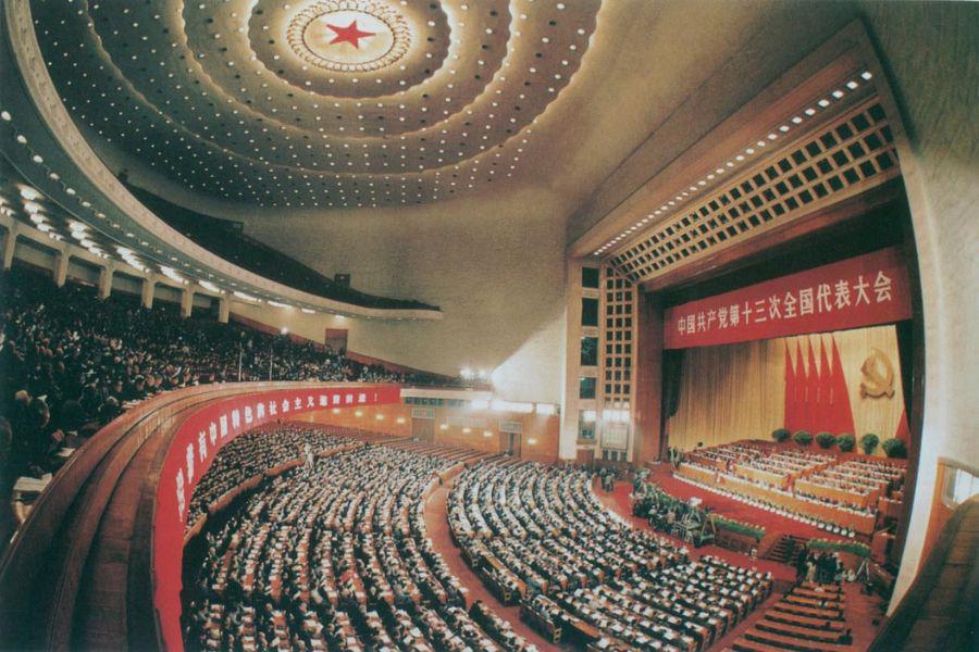 党的十三大系统论述了社会主义初级阶段理论和党的基本路线,确定分三步走实现现代化的发展战略。图为党的十三大会场。